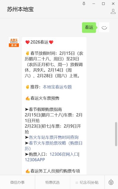 温馨提示:微信搜索【苏州本地宝】公众号,关注后对话框回复【春运】即可获得2026年春运时间、春节放假日历、春运火车票抢票日历、各火车站车票开售时间、务工群体购票专区开放时间及使用攻略、学生票购买指南等内容。